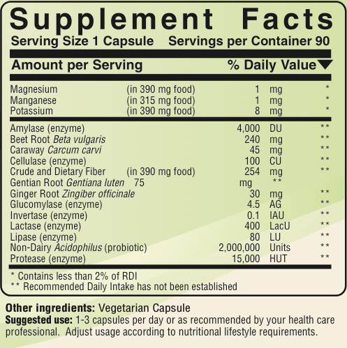 Pro-Enzymes combines vegetarian enzymes, herbs, fiber, naturally occuring Food minerals, and probiotics for a balanced vegetarian digestive product. Pro-Enzymes